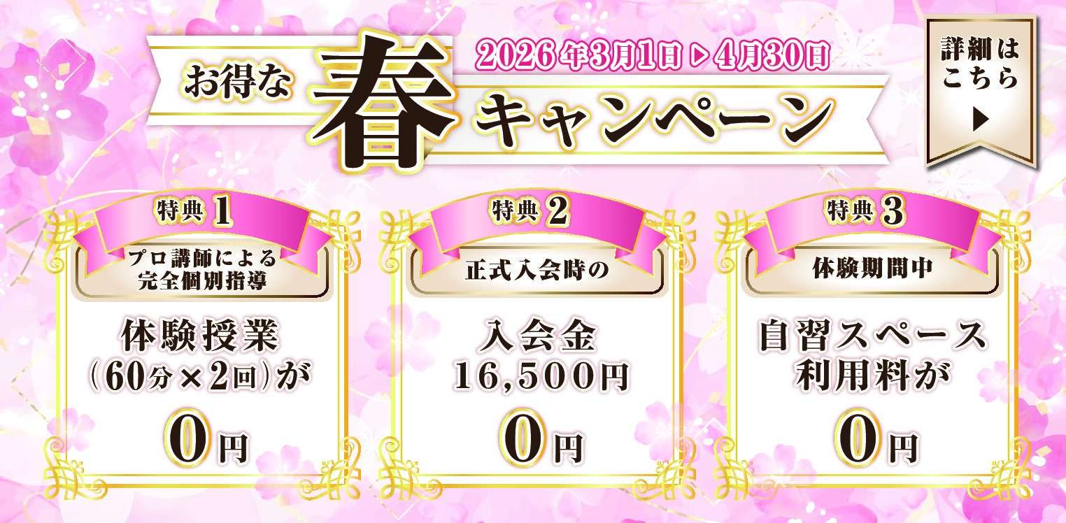 2026 お得な “春キャンペーン” のご案内 公開日:2026年2月18日 ブログ 毎年ご好評をいただいています お得な“春キャンペーン” を今年も実施いたします!所属プロ講師による無料体験授業や正式入会時の入会金¥0など、この時期ならではのお得なキャンペーン内容となっています。この機会に是非、Pro- […] 続きを読む